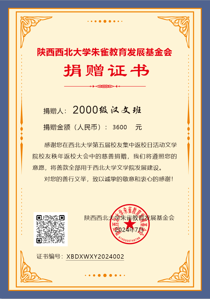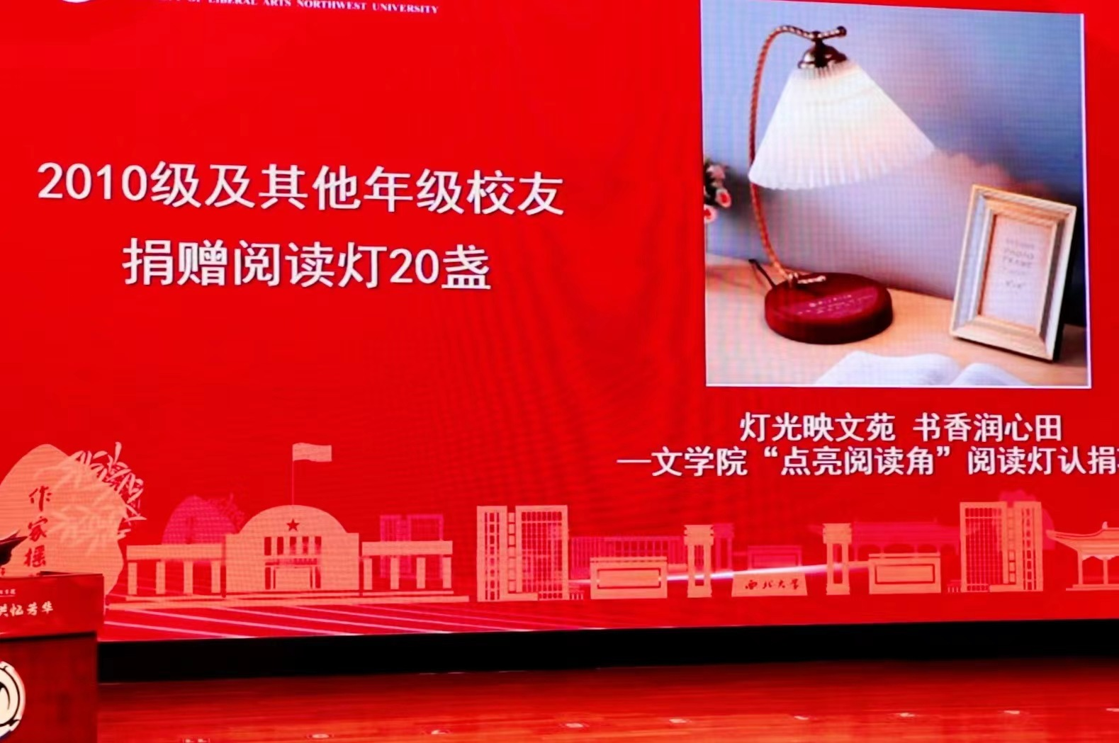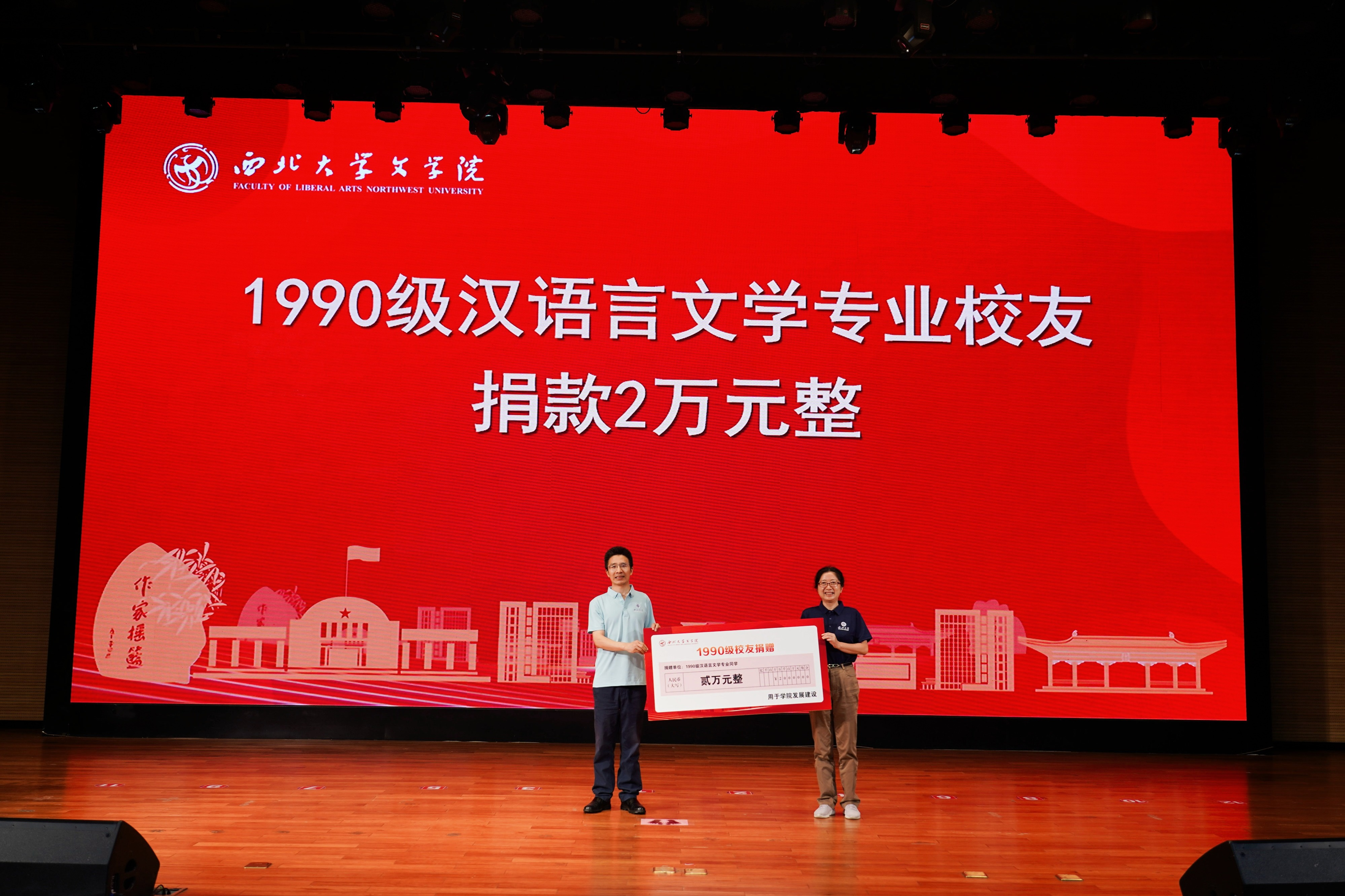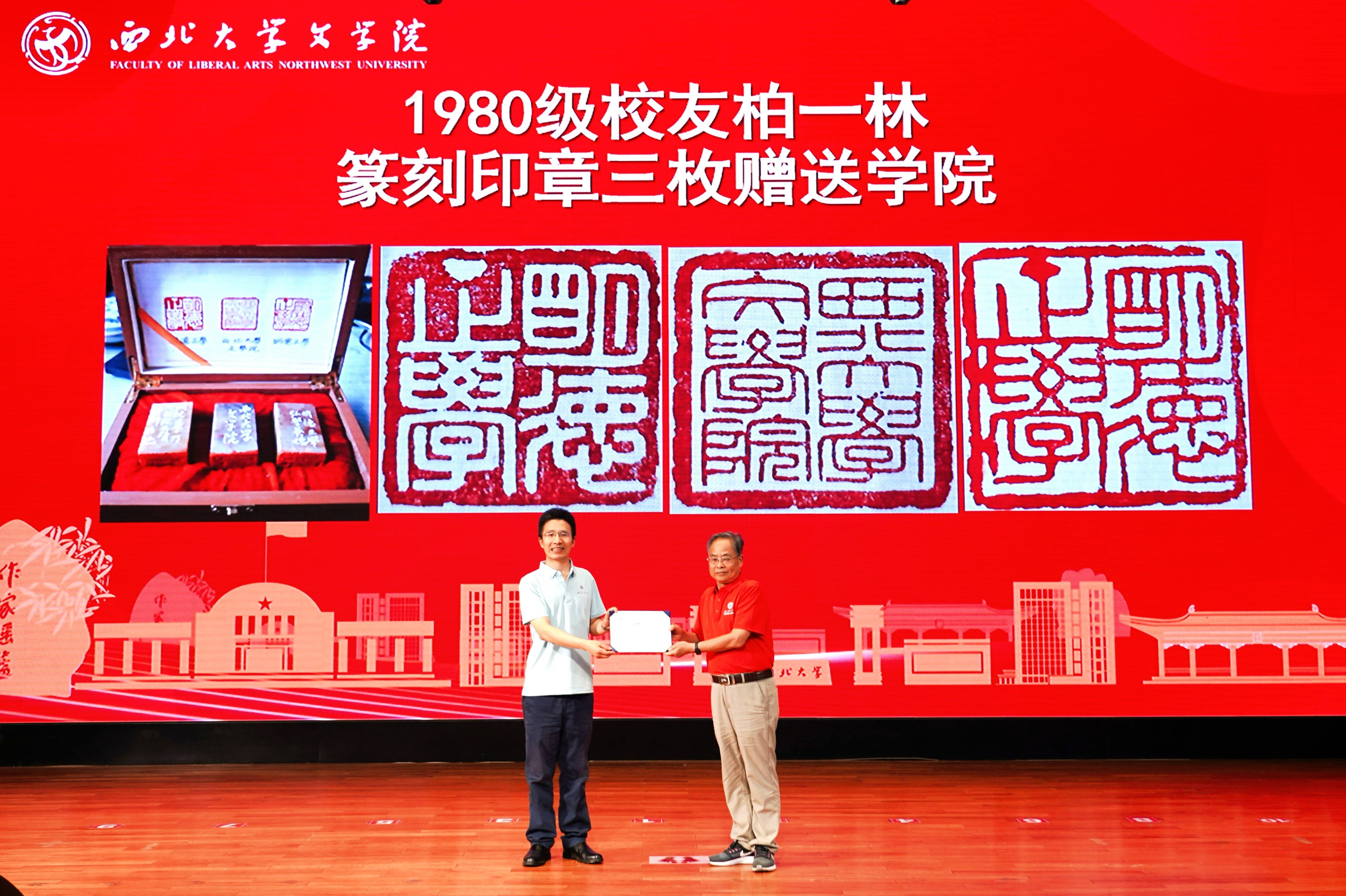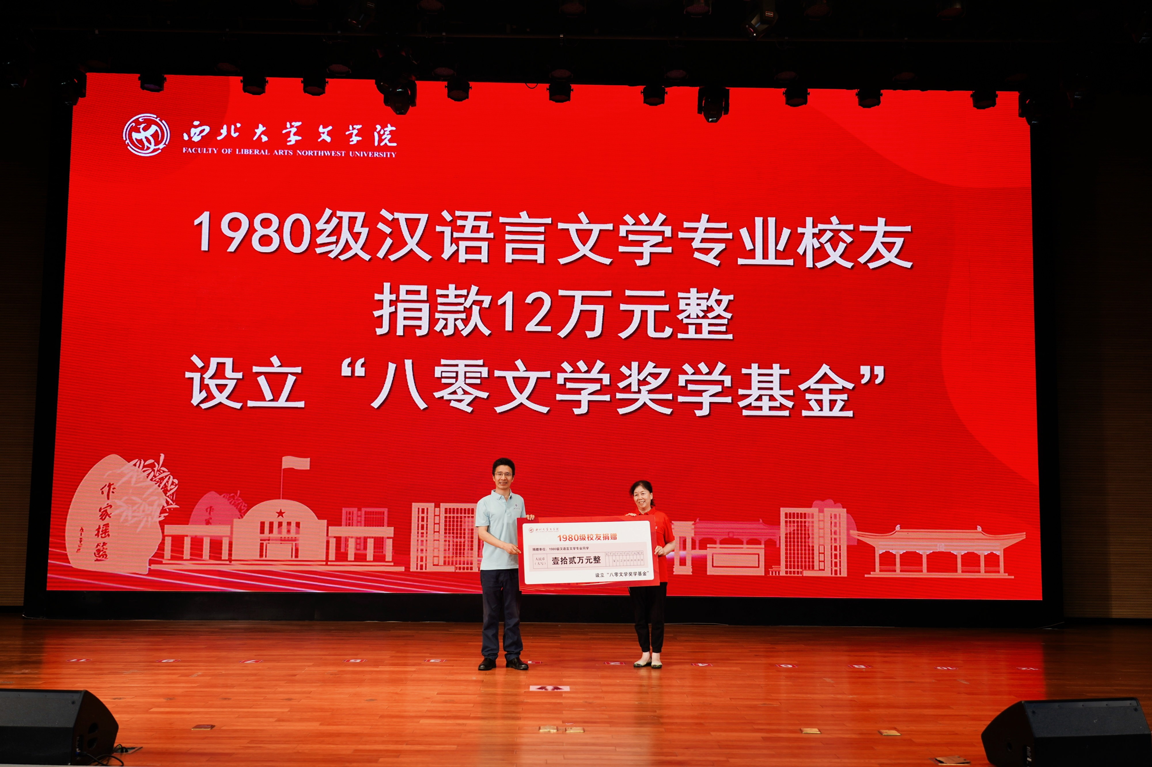 在当天下午举办的纪念大会上举行了返校校友捐赠仪式。其中1980级校友向学院捐赠人民币12万元整,设立“八〇文学奖学基金”,用于奖励在学业、学术研究、文学创作、社会服务等方面表现突出,体现学科综合素质的在校本科生。1980级校友柏一林镌刻印章三枚,赠送学院。1990级校友向学院捐赠人民币2万元整,用于学院发展建设。2000级校友向学院捐赠人民币3600元整,用于学院发展建设,同时向学院赠送金箔装饰画一幅。2010级及其他年级校友积极响应学院“灯光映文苑 书香润心田”---“点亮阅读角”阅读灯认捐项目,认捐阅读灯20盏,将摆放在bv伟德国际1946各阅览区。院长谷鹏飞代表学院接受了捐赠,并为捐赠校友颁发捐赠证书,对慷慨捐赠、襄助学院事业发展的热心校友表示感谢。