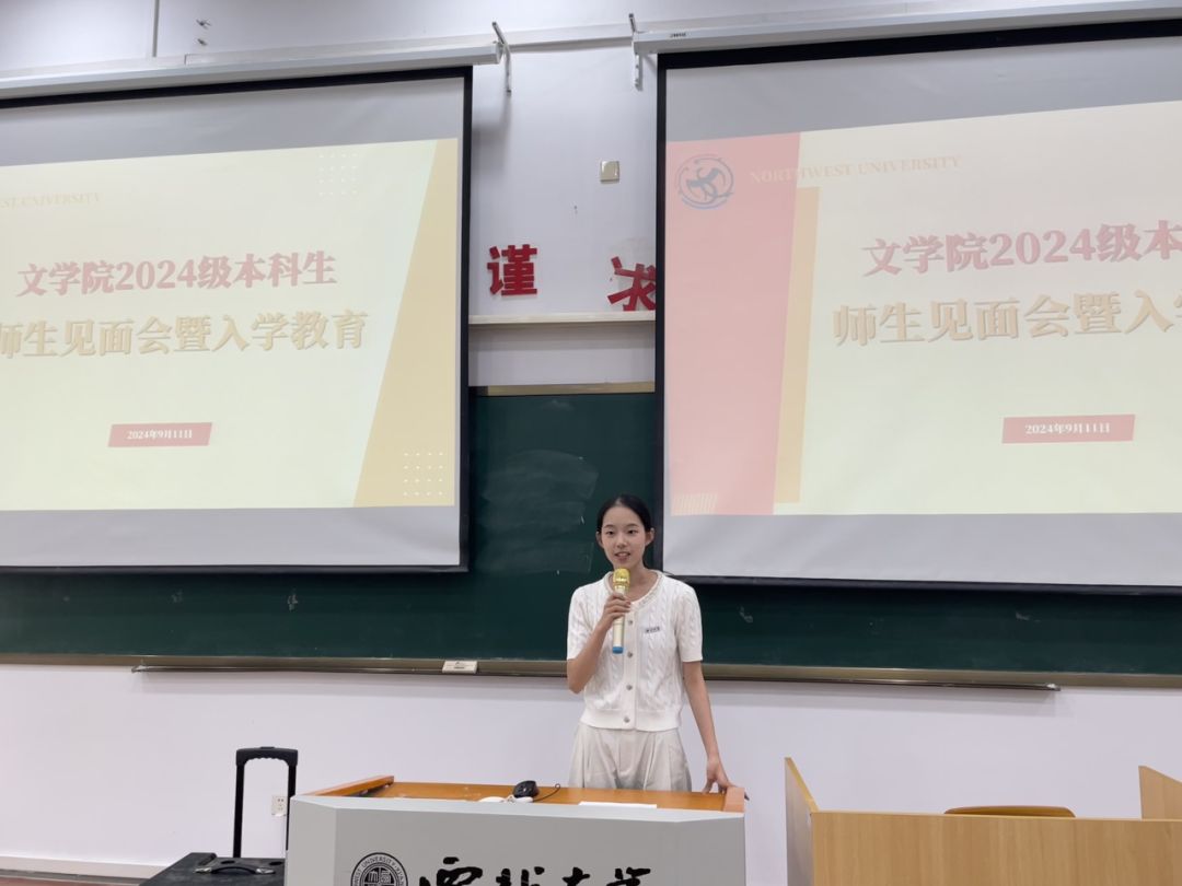 2024级中国语言文学类新生杨颜瑞代表全体新生发言,她讲述了自己对于文学的热爱和努力方向,号召同学们始终保持对文学的兴趣和热爱,珍惜学院提供的广阔的成长平台,在书籍中触摸文字的流变,在研究中破解语言密码,不断接受知识的洗礼,努力汲取充足的养分,追求真理、探索新知,在西大bv伟德国际1946茁壮成长、开花结果。