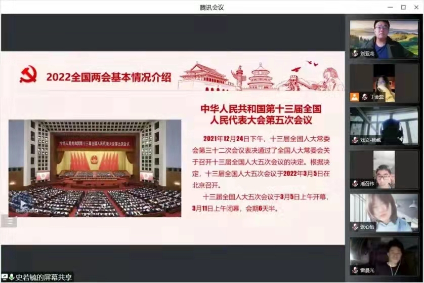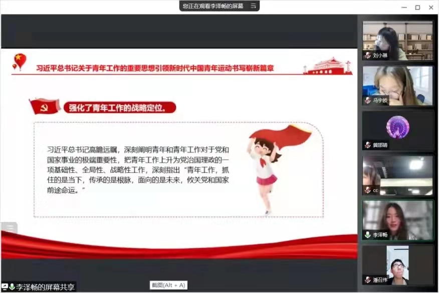 为献礼党的二十大,庆祝中国共青团成立一百周年,全面贯彻党的十九大和十九届历次全会精神,深入落实习近平总书记关于青年工作的重要思想,进一步筑牢我们团学干部的思想根基,3月23日下午,院团委邀请我校习近平新时代中国特色社会主义思想青年研习社成员面向我们全体团学干部开展了“喜迎二十大、永远跟党走、奋进新征程”线上主题教育活动。