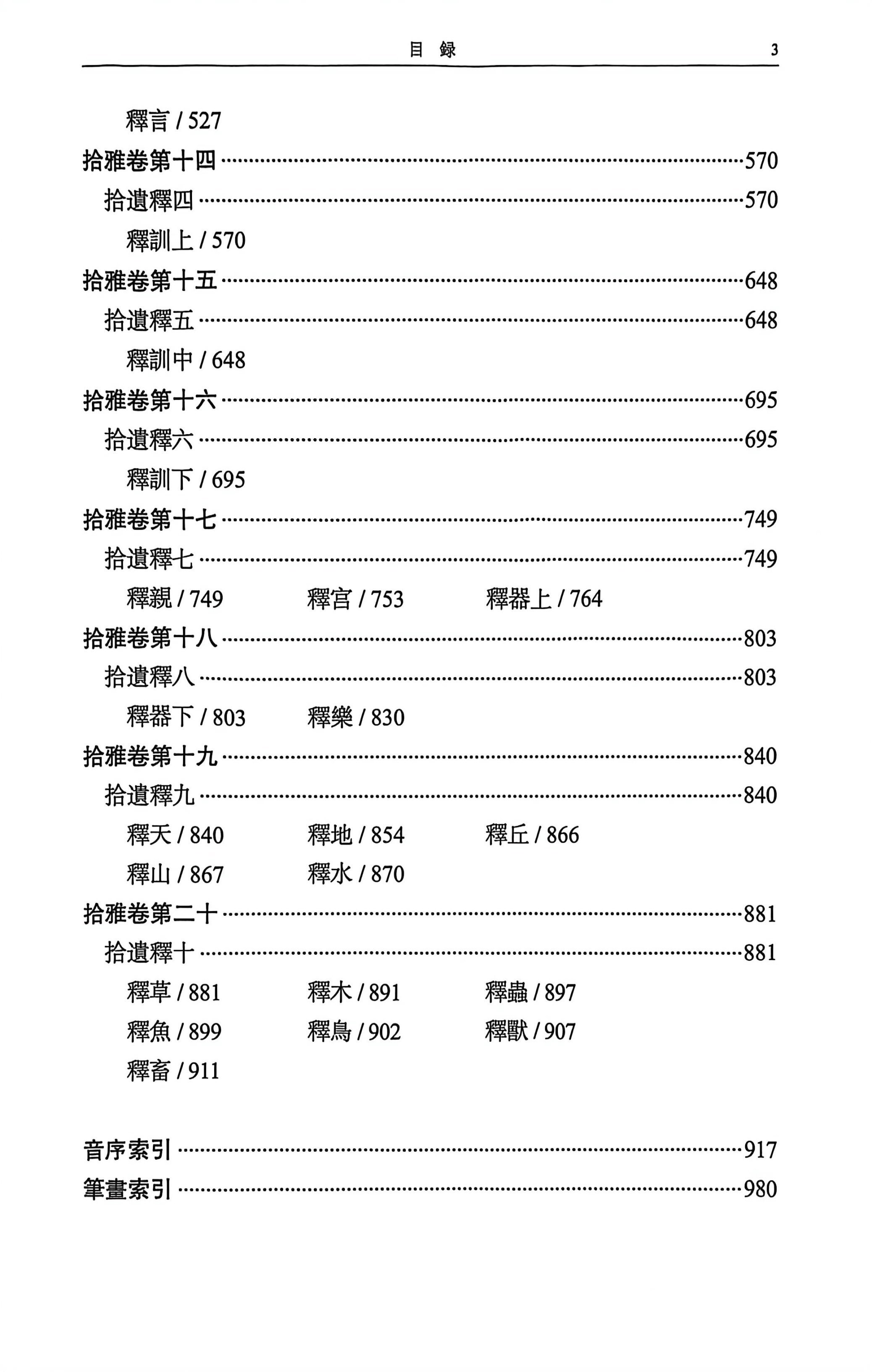 3.复刻二十卷本系列。道光壬午年(1822)高邮夏氏遂园本、道光乙未年(1825)青照堂丛书本、同治辛未年(1871)山阴童荣寿堂刻本等均为嘉庆庚辰二十卷本的复刻本。齐鲁书社《历代丛书汇纂·青照堂丛书》所收《拾雅》为道光乙未年本的影印本。