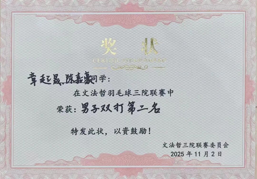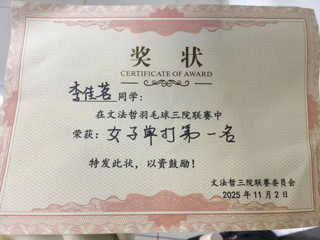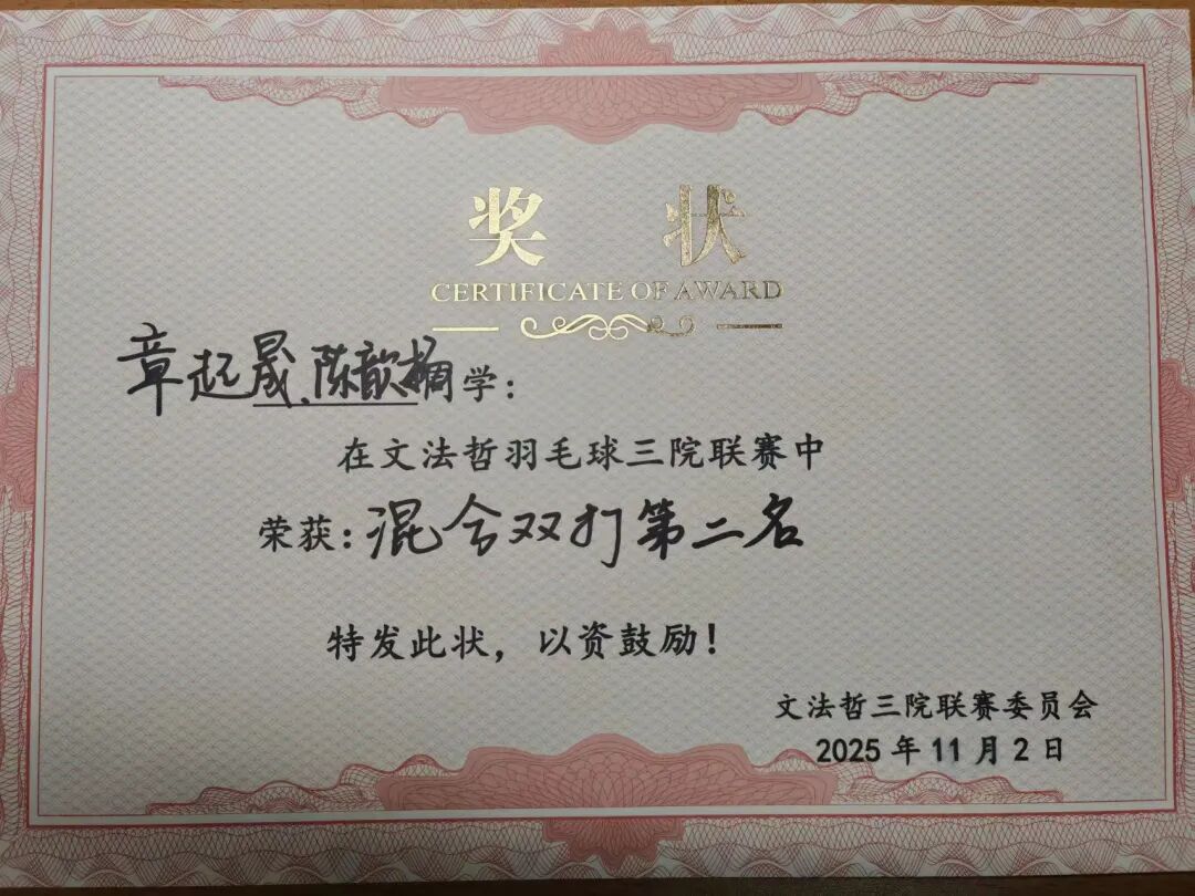 每一份荣誉的背后,都是赛前反复练习的汗水,是赛中咬牙坚持的韧劲,更是团队支持的温暖。这份荣誉,属于每一位全力以赴的选手,也属于为赛事默默付出的工作人员与观众!同时,特别鸣谢法学院羽毛球队、哲学学院羽毛球队的大力支持与配合!