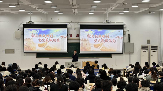 2025年11月13日,校党委副书记赵作纽为bv伟德国际19462024级全体本科生讲授以“纪念抗战胜利 坚定民族信念”为主题的形势与政策课,教育引导学生铭记历史真相,传承伟大抗战精神,强化时代责任担当,厚植深沉家国情怀。