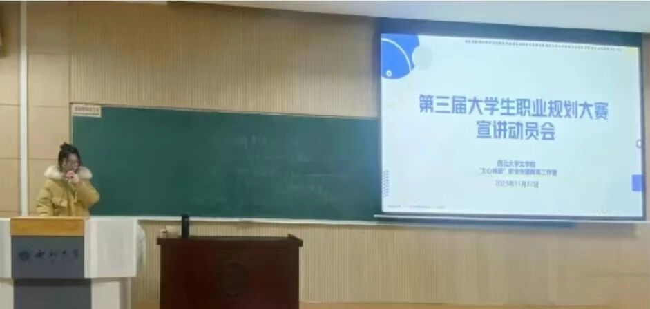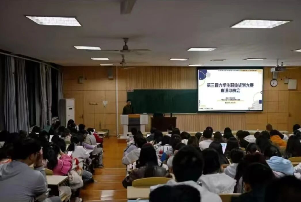 为进一步提升学生职业生涯规划能力,帮助我们学子充分备赛,实现以赛促学,引导学生树立正确的成才观、就业观和择业观,科学合理规划学业与职业发展,2025年11月17日晚,“文心林薮”职业生涯教育特色工作室在太白校区7507教室举办第三届大学生职业规划大赛宣讲动员会。会议由辅导员杨崧维主持。