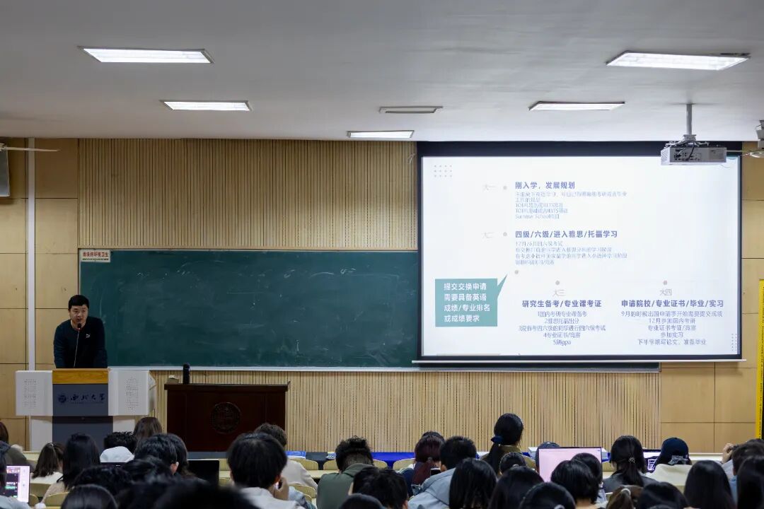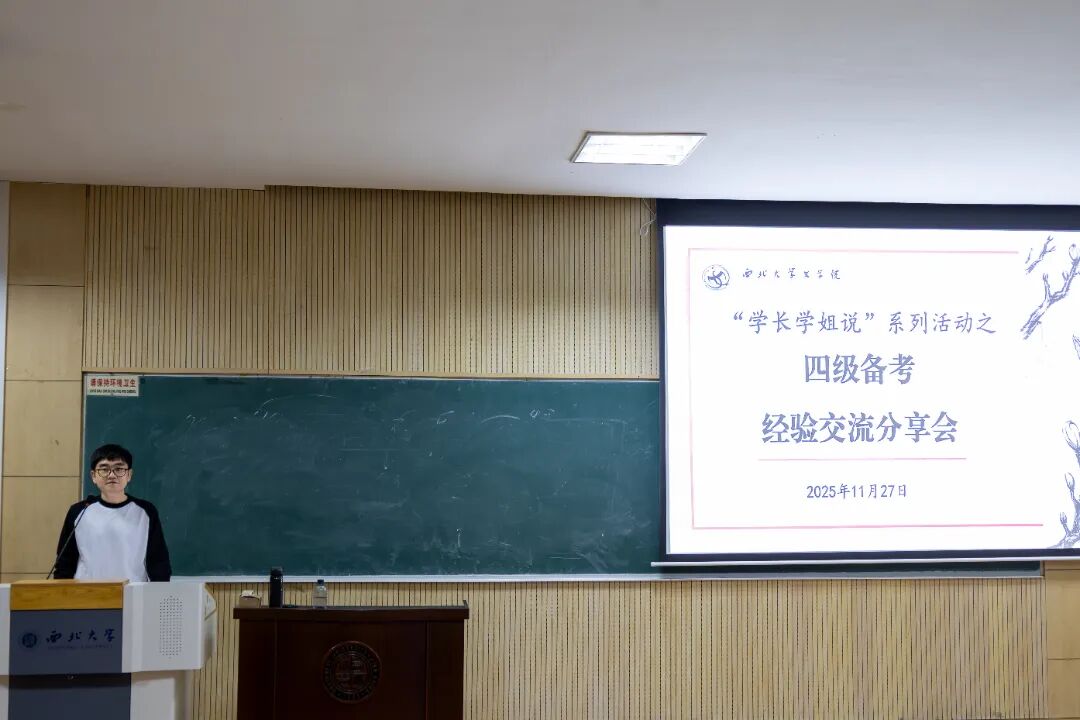 为深入推进“我为学生办实事”活动,发挥学院朋辈帮扶作用,切实解决学院学生在学习、生活、实践过程中存在的困难,帮助同学们掌握大学英语四级备考技巧、规划未来发展方向,11月27日,bv伟德国际1946于太白校区顺利举办“学长学姐说”系列活动之四级备考、出国留学经验分享交流会,邀请专业留学生涯规划师和3位优秀学姐从备战考试、资料准备、就业前景等方面为2025级本科生分享经验。该活动由2025级本科生辅导员杨崧维主持,2025级全体本科生参加。