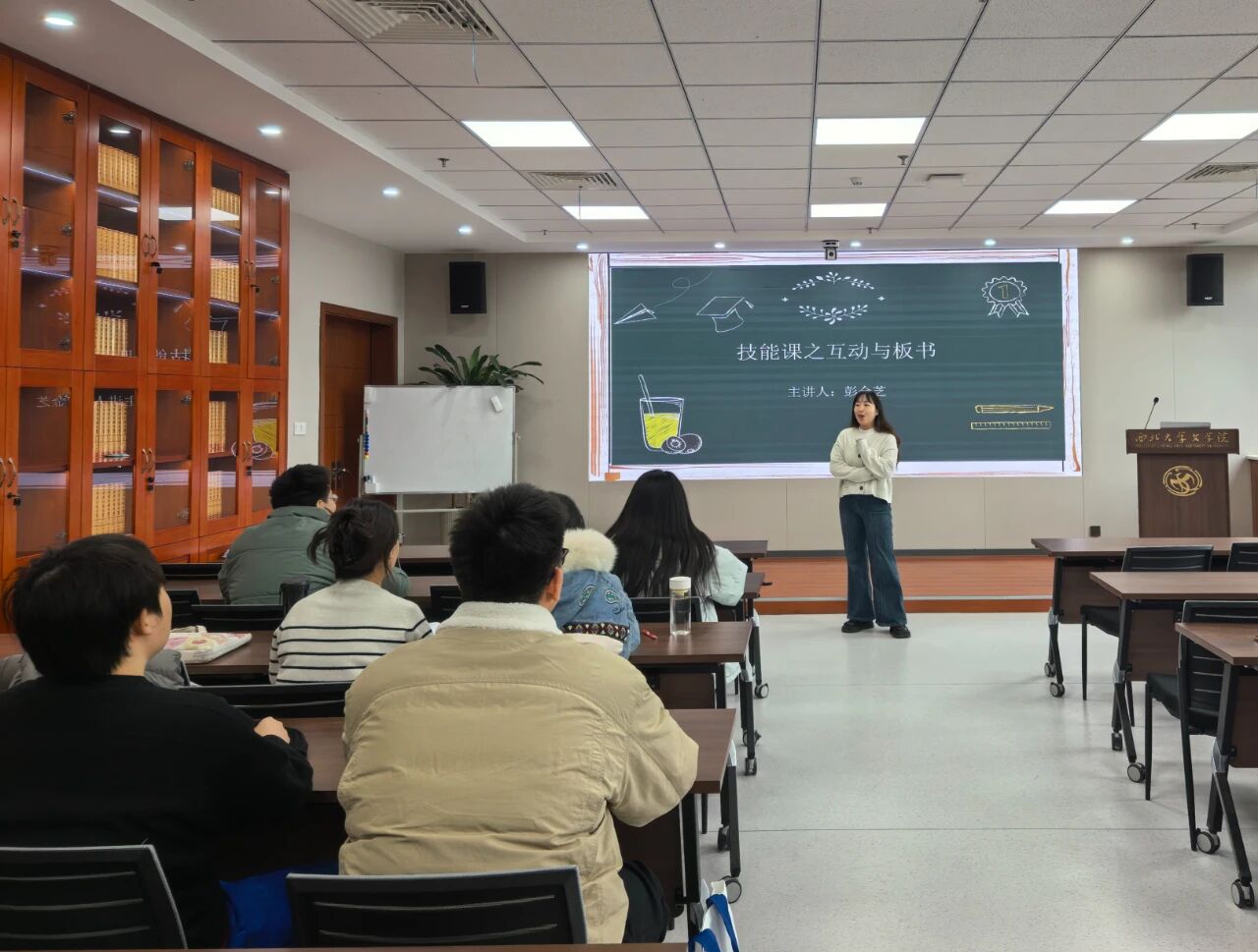 12月3日,彭金芝老师围绕“板书与互动”系统讲解了板书设计的原则与技巧,强调板书应突出重点、条理清晰、布局合理,结合学科特点融入图形与符号,增强视觉引导效果。通过现场示范与案例对比,帮助学员理解如何将教学内容凝练为可视化结构。随后开展实操训练,教师即时点评指导。