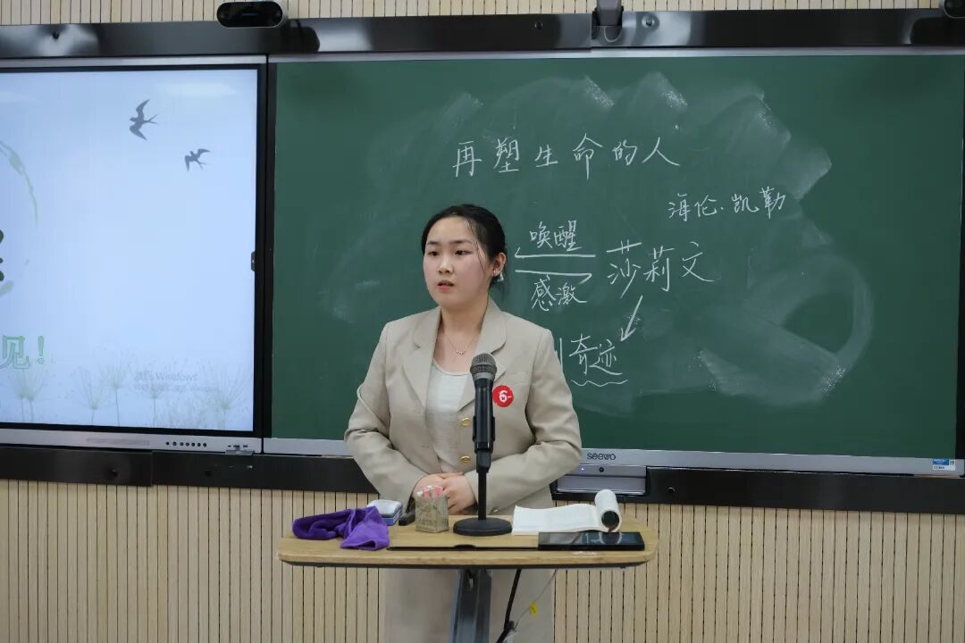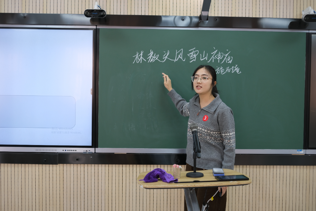 比赛分为“无生试讲”与“现场答辩”两大环节,全程井然有序、亮点纷呈。在15分钟的“无生试讲”环节中,11位选手分别围绕小学、中学语文课程内容,自主完成教学设计,通过课堂导入、新知教学、互动提问、总结升华、作业布置等完整教学流程,充分展现了教学目标设定、教学重难点突破及课堂互动设计能力。板书设计简洁美观、教学语言生动流畅、教学方法灵活多样,部分选手还融入了情境教学、小组讨论等创新形式,展现了新时代准教师的教学创新思维。