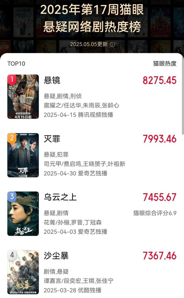 《悬镜》2025年第17周猫眼悬疑⽹络剧热度榜夺冠